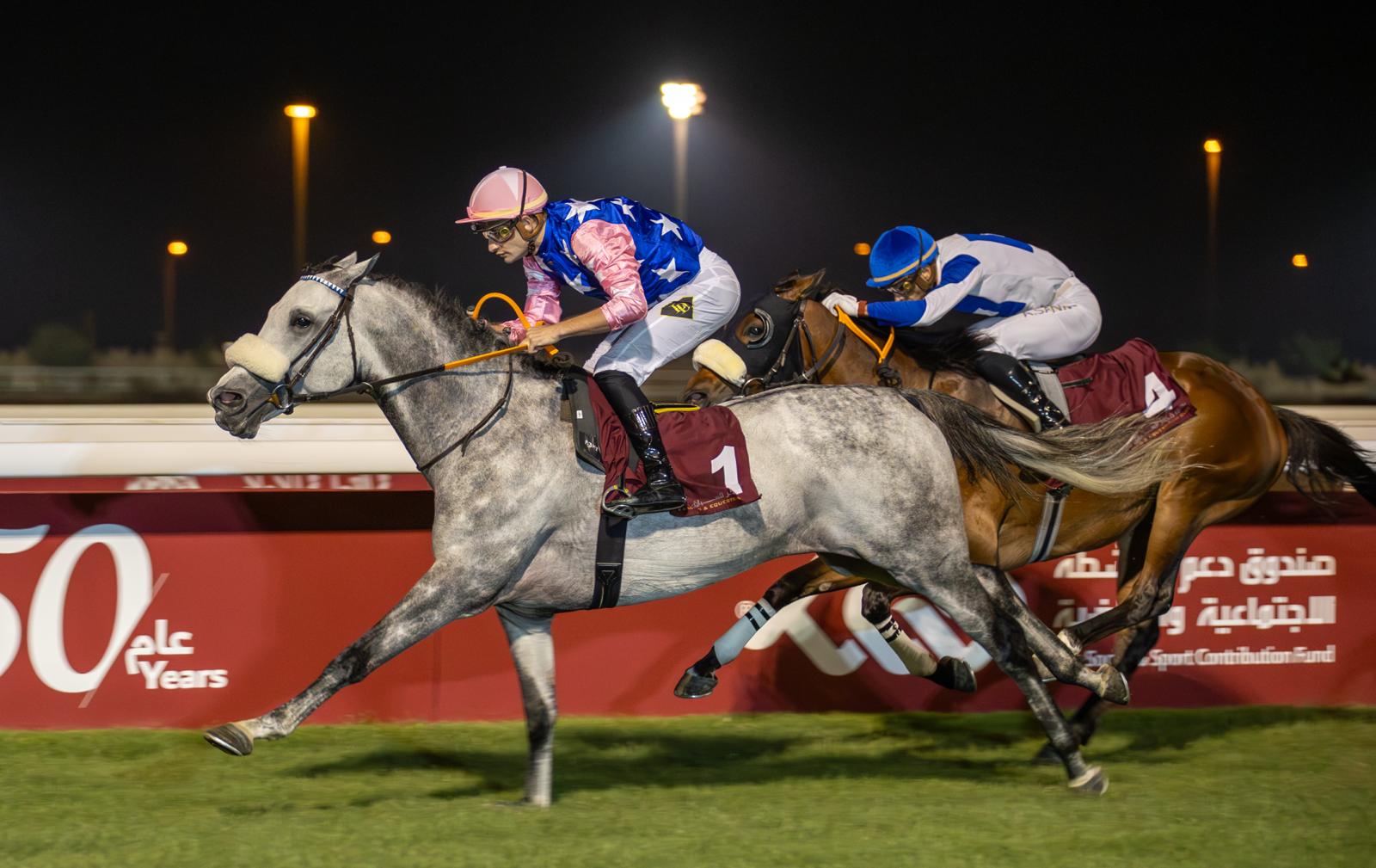 Aneed Al Shahania (Azadi x Al Anga) maintained his outstanding strike-rate with a hard-fought victory in the Class 2 Purebred Arabian Conditions for 4YO+ over 2100m. The 5YO grey horse, owned by H.E. Sheikha Reem bint Mohammed bin Khalifa Al-Thani and trained by Rudy Nerbonne, landed his fifth win from six career starts, with his only defeat being a runner-up effort. Under Lukas Delozier, he prevailed by a length in a tightly contested finish. The four-runner field raced in single file for much of the journey, with Khalil Du Croate (No Risk Al Maury), trained by Julian Smart for Khalifa bin Sheail Al Kuwari and ridden by Alberto Sanna, dictating the pace throughout. He was tracked by Sun Amer (Amer), owned by Khalid Mohammed Al-Harami, trained by Bader Al Balushi and ridden by Marco Casamento, Raed (Amer) and Aneed Al Shahania in that order, with little change in the running positions until the home straight. Once heads turned for home, Sun Amer briefly took over, but Aneed Al Shahania swept past him with a sharp acceleration to strike the front. Khalil Du Croate rallied strongly on the inside and Raed, representing Wathnan Racing for trainer Alban de Mieulle under Soufiane Saadi, also closed fast from behind, setting up a three-way battle to the line. Aneed Al Shahania, however, proved toughest in the final strides, holding off Khalil Du Croate by a length, with Raed a further length back in third. Sun Amer, owned by Khalid Mohammed Al-Harami, trained by Bader Al Balushi and ridden by Marco Casamento, finished fourth, only a short head behind the minor place getters.