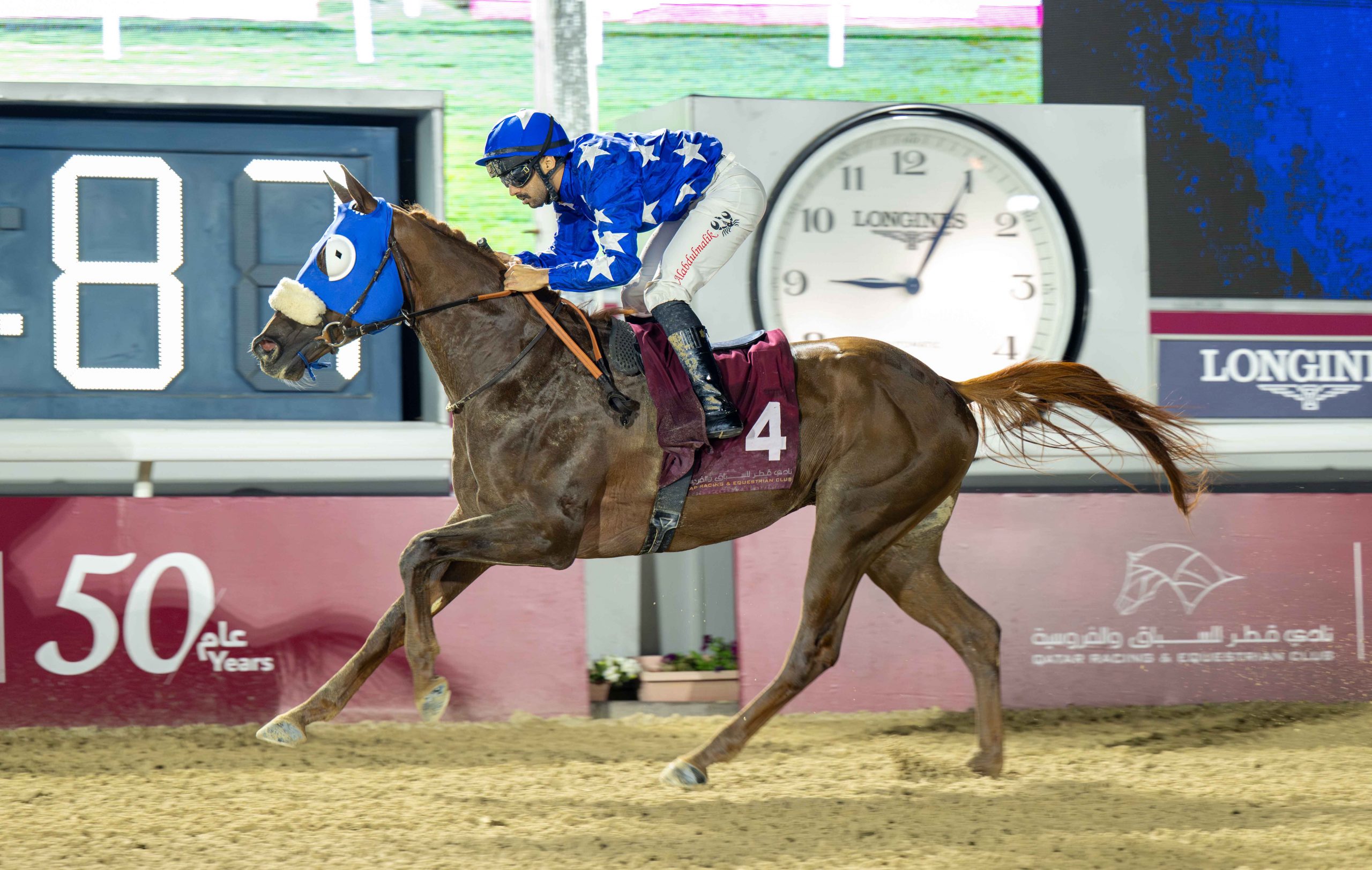 Ta’hoos Al Shahania (Harran ASF x Najda) landed the second race on the card, a Local Purebred Arabian Handicap for ratings 0–65 over 1200m, Class 6, contested by 14 runners. The five-year-old chestnut horse, owned by HH Sheikh Mohammed bin Khalifa Al Thani and trained by Rudy Nerbonne, recorded his second victory from nine career starts and maintained his remarkable record of never finishing outside the first three, surging from the rear to score decisively by 3½ lengths under Mohammed Hassan Ali Alabdulmalik. Settled at the back after the break, Ta’hoos Al Shahania watched as Kanz Al Adeed (AF AlBahar) led the early stages from Alam Al Zaeem (Alam Al Khalediah) and Taimoor (Nizam). Midway through the race, Thaar (La Hoor) improved to take over and maintained the advantage approaching the home turn, with Taimoor still tracking in second as the tempo lifted. Rounding the bend, Ta’hoos Al Shahania began a strong run from the rear alongside Habes (Harran ASF), both making rapid ground on the leaders. Though Thaar held a narrow advantage early in the straight, the final 300m saw Ta’hoos Al Shahania unleash a powerful surge to take command and quickly put the result beyond doubt, drawing clear in emphatic fashion. Taimoor, owned by Abdulaziz Saleh Al-Otaibi and trained by Mohammed Hassan Al Matwi, stayed on under Saleh Faraj Al-Otaibi to take second, finishing a length ahead of Habes. The latter, representing Abdulaziz Saleh Al Jaber and prepared by Hadi Al Ramzani, ran on under Soufiane Saadi to secure third.