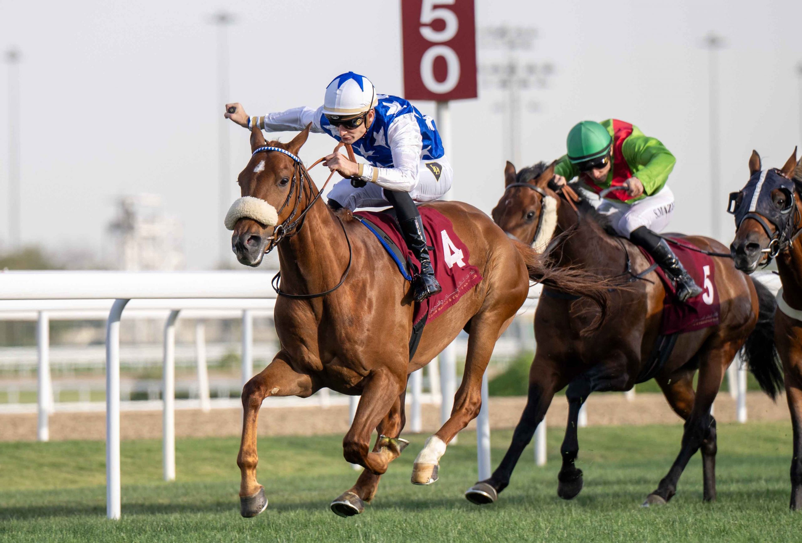 Safwan Al Shahania (Gazwan x Vega De Faust) landed the second race, a Purebred Arabian Premium Maiden Plate over 1600m (Class 6) for four-year-olds, drawing 12 runners, pulling clear by 2¼ lengths. The chestnut colt, representing Al Shahania Stud, is trained by Rudy Nerbonne and was ridden by Lukas Delozier, improving markedly from his debut third to open his account at the second attempt, marking himself down as one to follow. Settled in fourth from barrier 3, Safwan Al Shahania tracked a solid early tempo set by Jabra’an Al Shahania (Gazwan), with HM Al Jadwal (Mister Ginoux) applying pressure and Mamunat Al Jasra (Al Mamun Monlau) close behind. Passing the 800m marker, HM Al Jadwal moved forward to take over, with Jabra’an Al Shahania sticking on closely as the race began to build. At the top of the straight, HM Al Jadwal regained the advantage and looked set to see it out approaching the 300m marker. However, the race quickly turned into a fierce contest, with Wahdan (Mister Ginoux), who had been well off the pace, arriving with a powerful late run while Safwan Al Shahania also quickened to join the leaders. The trio were almost in line, positions changing rapidly with every stride, creating a thrilling finish. Inside the final 100m, Safwan Al Shahania dug deep, finding extra to assert and then pull away late, with the margin stretching out in the closing strides despite the intensity of the battle beforehand. Jabra’an Al Shahania, in the colours of Hamad Khalid Al-Qahtani and from the Mohammed Al Ghazali yard, with Soufiane Saadi aboard, kept on well to take second, a quarter of a length ahead of the Hamad Al-Jehani-trained Wahdan, who finished strongly from the rear for Khalifa bin Mohamed bin Khalifa Abdullah Al Attiyah under Szczepan Mazur to take third.